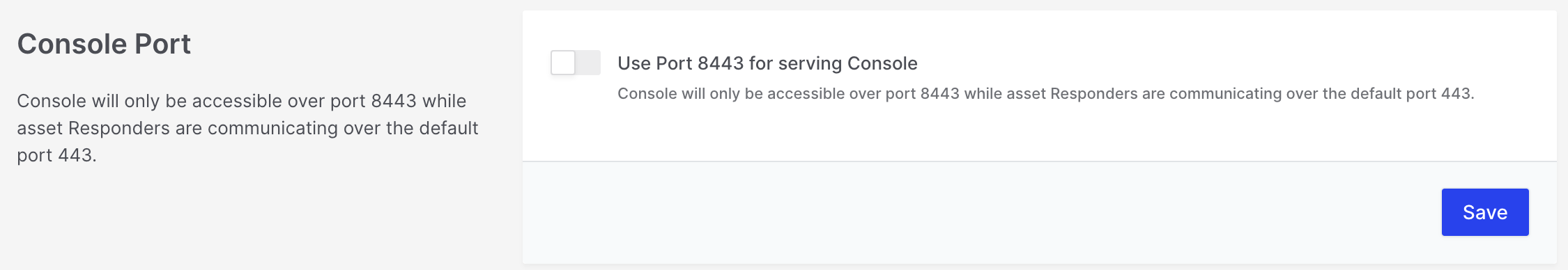 - Asset -> Console: Used by responders on assets to communicate with the console. This is the default and preferred port, in some cases, users may wish to switch to 8443:
