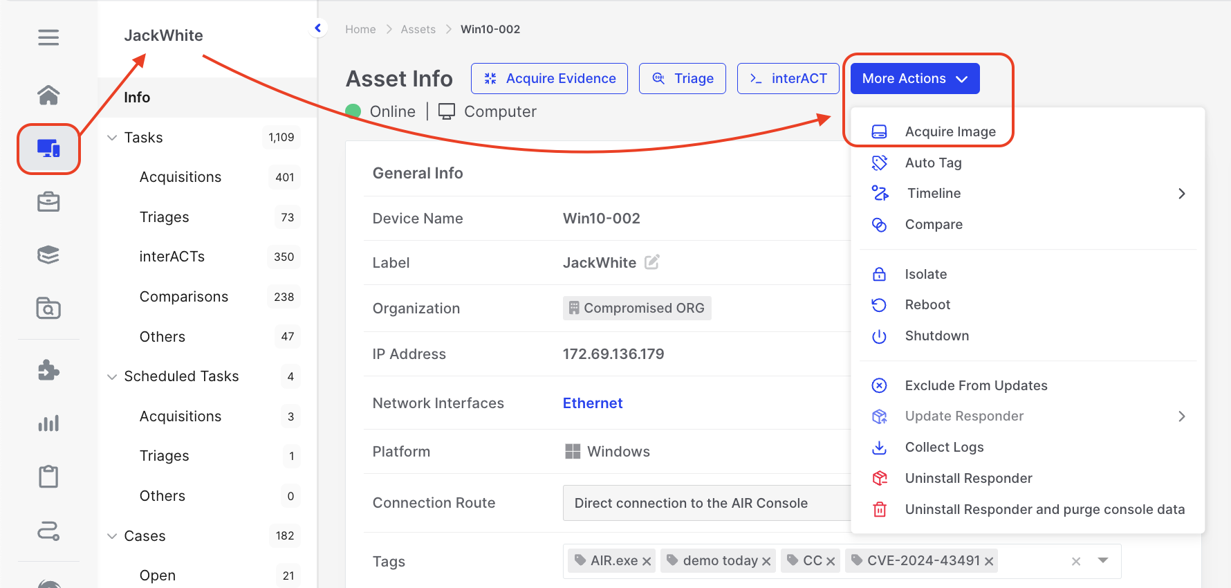 In the XDR Forensics UI, select Assets from the Main Menu, then navigate to Devices and select the asset you wish to image. In the Asset Info window, click the Asset Actions button to reveal a drop-down menu listing the actions available for that asset. Acquire Image is one such option: